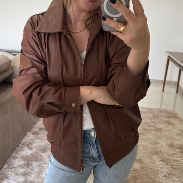 Elegante e versátil, a nossa bomber em couro legítimo tem linhas limpas e caimento impecável.