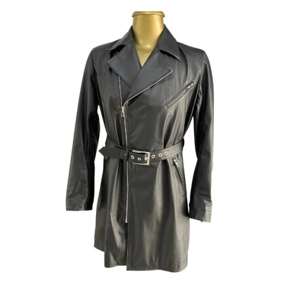 Sobretudo masculino em couro legítimo OMK Couro , uma roupa de alto estilo, com corte alongado e fechamento em zíper assimétrico.